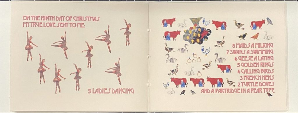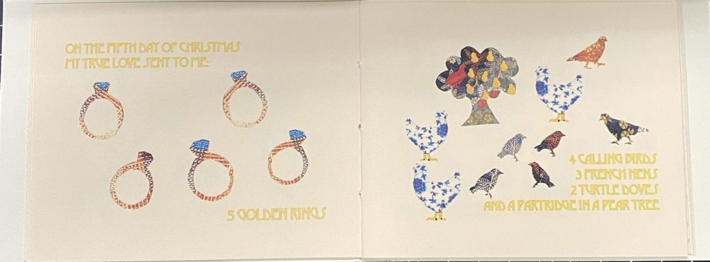 Made for friends and family celebrating Christmas 2017, this zine presents the classic poem/song with patterned collage, stenciled, and repeated images. It was bound together with string in a patterned cover paper with a hand printed pear on the front.
