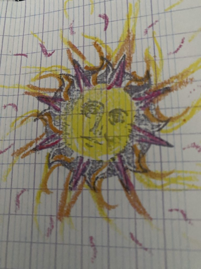 This mini-zine has a short poem typed on graph paper and is illustrated with stamped images of butterflies and suns that become increasingly colorful as the poem progresses.