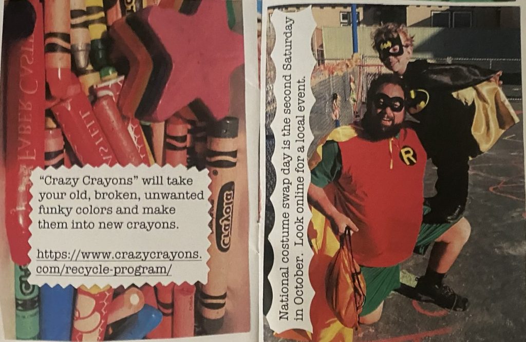 An informational and humorous zine on how to recycle a wide variety of items including clothing, eyeglasses, corks, greeting cards, crayons, and halloween costumes. colorfully collaged art throughout.