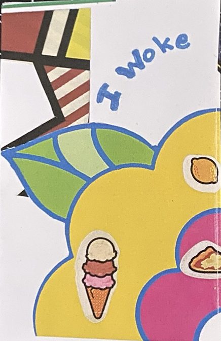 This is a very short poem abut a dream I had the night before I made the zine. The dream was a semi lucid dream and filled me with very liberated feelings. It is illustrated with bright colored patterns and stickers of random ordinary items.